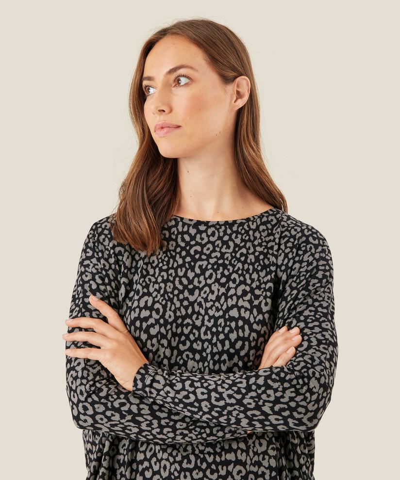 You can never have enough beautiful basic tops. This leopard print top is cut in a soft jersey fabric that makes it so comfortable you'll want to keep it on all day. With its oversized cut, the top falls loosely over the body, while the long, narrow sleeves create a nice contrast. The top also features a round neckline, dropped shoulder seams and short side slits. Wear it with slim black trousers for an effortlessly stylish look.